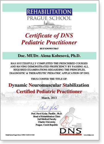 all tests associated with their training, and demonstrated competency in both knowledge and skill execution in the application of the diagnostic & therapeutic principles of DNS. They have earned the title "Certificate of DNS Pediatric Practitioner" (DNSPP) issued by the Prague School of Rehabilitation, Prague, Czech Republic.